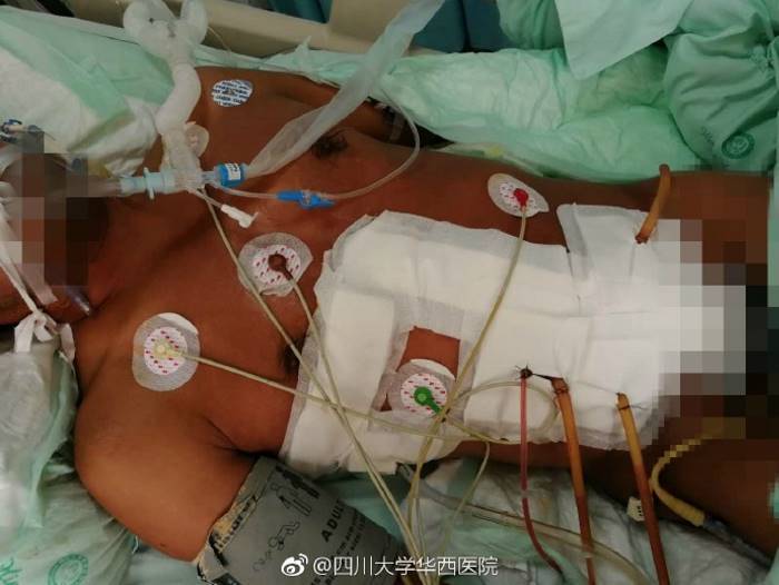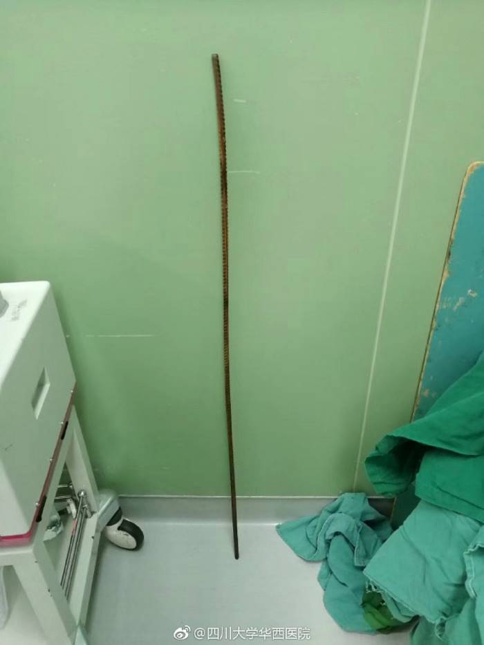 Пострадавшего, находившегося в ясном сознании, отвезли в больницу провинции Сычуань с металлическим прутом диаметром 1 сантиметр внутри тела, прошедшим через торс и вышедшим из правого плеча. Во время 7-часовой операции команда врачей, состоящая из хирурга, кардиохирурга и уролога, успешно удалила стержень. «Пациенту очень, очень повезло. Прут не повредил ни одного из его жизненно важных органов, — заявил доктор Ма Линь из отделения кардиохирургии Западно-Китайского медицинского центра в Сычуаньском университете. — Нет существенной потери крови и его система кровообращения кажется прекрасной».