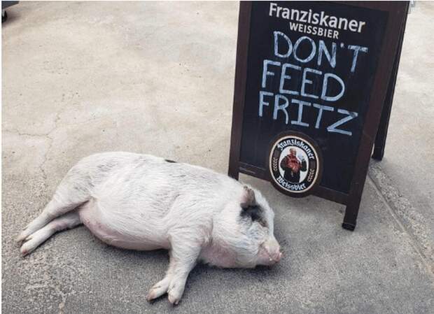 8. В немецком ресторанчике по патио гуляет толстый свин, а надпись просит не кормить Фрица