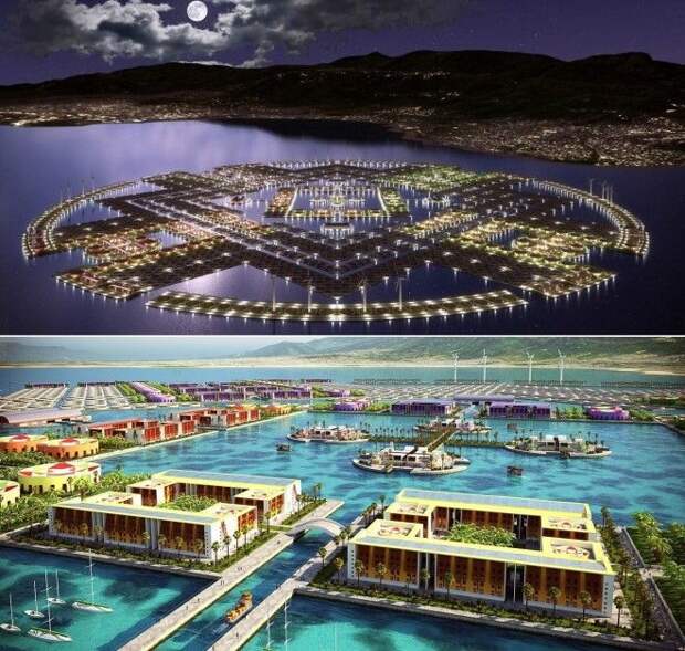 9. Гаити представляет собой островное государство, разоренное бедностью и стихийными бедствиями, вроде землетрясений, которые сравняли большую часть Порт-о-Пренса с землей и оставили миллионы людей без жилья. Архитектор Э. Кевин Шопфер представил новый плавучий город на 30 000 жителей в непосредственной близости от берега с жилой площадью, поддерживающей сельское хозяйство и легкую промышленность. 3-километровый в диаметре комплекс состоит из четырех кварталов в виде плавающих модулей, соединенных между собой линейной системой каналов. Способный выдерживать ураганы и тайфуны, город может быть при необходимости расширен.