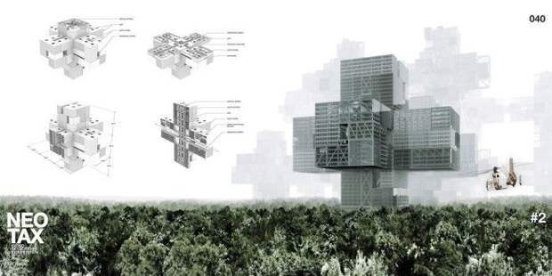 10. Что, если бы наши города были такими, словно наши архитекторы работали с трехмерной сеткой? Идея принадлежит конкурсу eVolo 2011 Skyscraper Competition и называется NeoTax. Строения, которые растут вверх и далее. Организованные в горизонтальную и вертикальную сетки улиц, здания основаны на модульной системе, где каждый модуль можно рассматривать как отдельное здание, соединенное с другим на уровне земли. Грубо говоря, все мы будем соседями и не будем корчевать зеленые насаждения ради строительства.