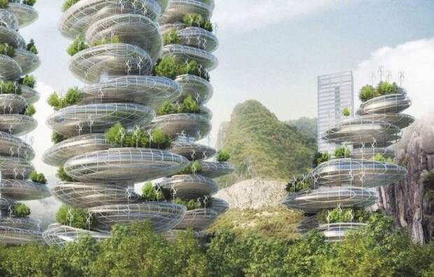 11. Бельгийский архитектор Винсент Каллебо известен своим дизайном, который черпает вдохновение из природных форм, вроде плавающих городов в форме лотоса. В этот раз он представил вертикальный город Шэнчьжень в Китае, сделанный в виде кэрнов, или каменных пирамид. «Задача в создании благоприятной городской среды с нулевым уровнем выбросов углерода и позитивной энергетикой», — говорит архитектор. В этом проекте город должен жить по законам джунглей, быть высокоплотным и обладать садами и огородами, устроенными прямо в жилых башнях. Каждая башня содержит 20 остекленных «камешков», покрытых солнечными батареями и ветряными турбинами.