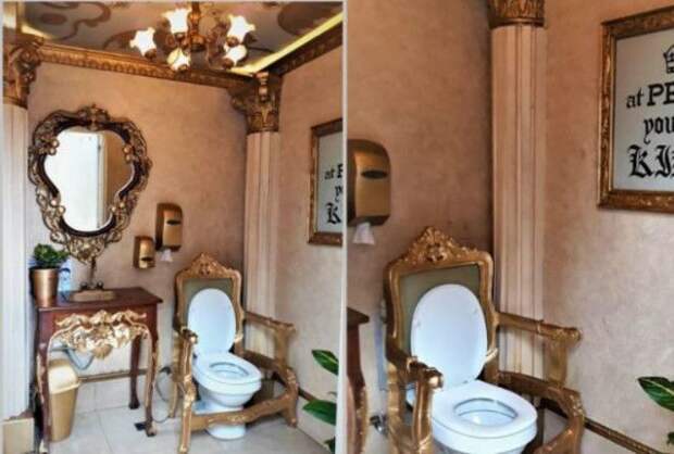 Туалет на заправке Petron в Кесоне, Филиппины, достоин принимать монарших особ. Судя по всему, проектировщики сделали все, чтобы превратить уборную в тронный зал: на стенах позолоченные барельефы, зеркало в золотой раме, на потолке — люстра, а сам унитаз напоминает трон.