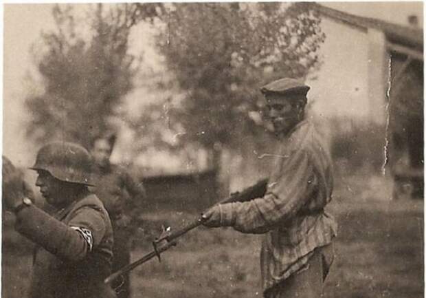 9. Бывший узник концлагеря держит под прицелом нацистского солдата