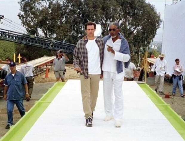 11. Джим Керри и Морган Фримен на съёмках фильма “Брюс Всемогущий” 2003 год