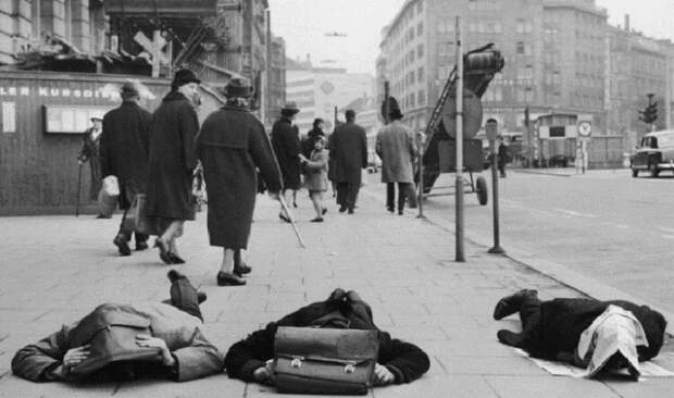 1. Активисты демонстрируют, как вести себя в случае ядерного удара, Гамбург 1963 год