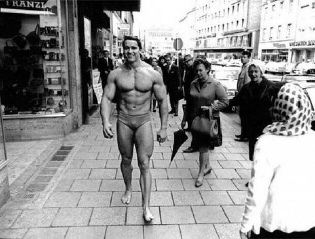 8. Арнольд Шварценеггер прогуливается по улицам Мюнхена, демонстрируя отличную физическую форму, чтобы стимулировать окружающих посещать спортзал