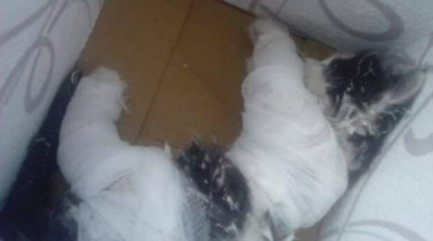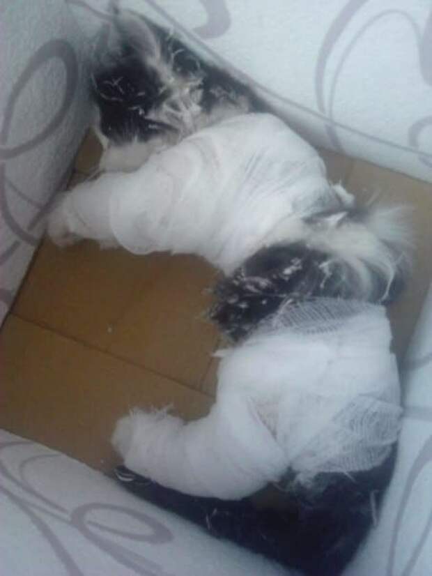 Котенок задыхался от крови, поэтому ему в первую очередь прочистили нос, а затем наложили гипс на обе лапы, сообщив, что, скорей всего, придется сделать штифтование. Чтобы убедиться в правильности диагноза, на следующий день Тамара отправилась с малышом в другую клинику. Во время осмотра выяснилась, что одна лапа была загипсована поверх открытой раны, из-за чего она загноилась.