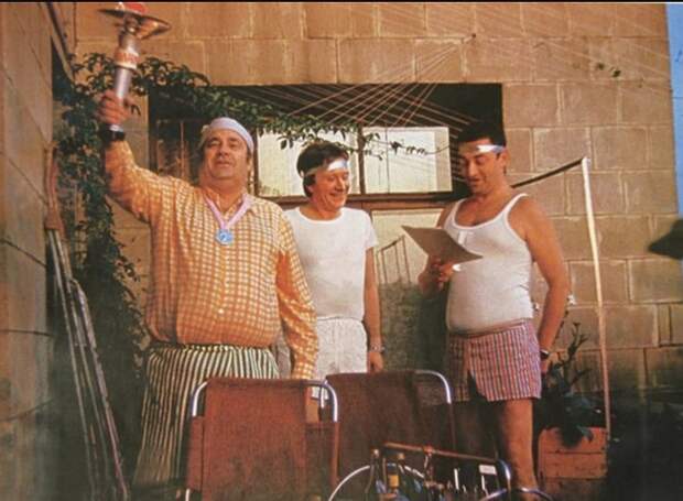 В кадре – знаменитые люди. Слева, с факелом в руке и с медалью на груди – режиссёр Эльдар Рязанов, в центре улыбается великий артист Андрей Миронов, а справа читает с листа что-то очень смешное писатель-сатирик и драматург Григорий Горин.