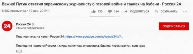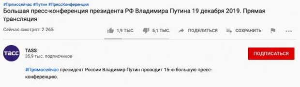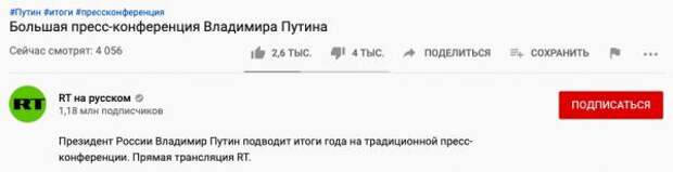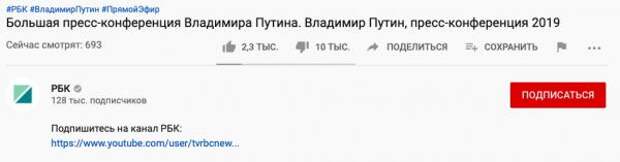 А ещё пользователи твиттера обратили внимание на соотношение лайков и дизлайков под трансляциями пресс-конференции в YouTube. На момент написания заметки количество дизов под трансляциями RT, ТАСС, «России-1» и РБК значительно превышает число лайков.