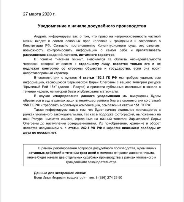 Оригинал Андрей Петров вообще разочарование, не знаю что я ему сделала, я думала мы подружки.Разочарование Зарыковской дошло и до самого Петрова. Каким образом? Узнав о сливе Дарья подала на Андрея в суд за нарушение её права на частную жизнь. О чём он и рассказал в своём канале.