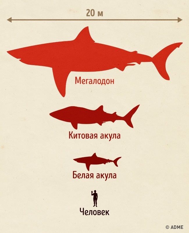 Самая большая акула в мире — мегалодон — бороздила глубины океанов около 28 млн лет назад. Мегалодон был настоящим царем подводного мира, достигал 16 метров в длину и весил примерно 47 тонн.