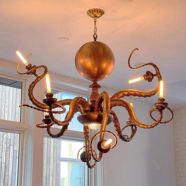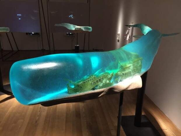 Красивая скульптура в форме кита с инсталляцией кораблекрушения