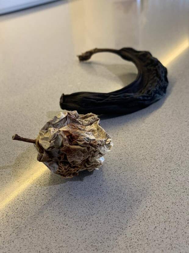 Узнаете яблоко и банан? Их оставили на полгода в сухом, темном помещении.