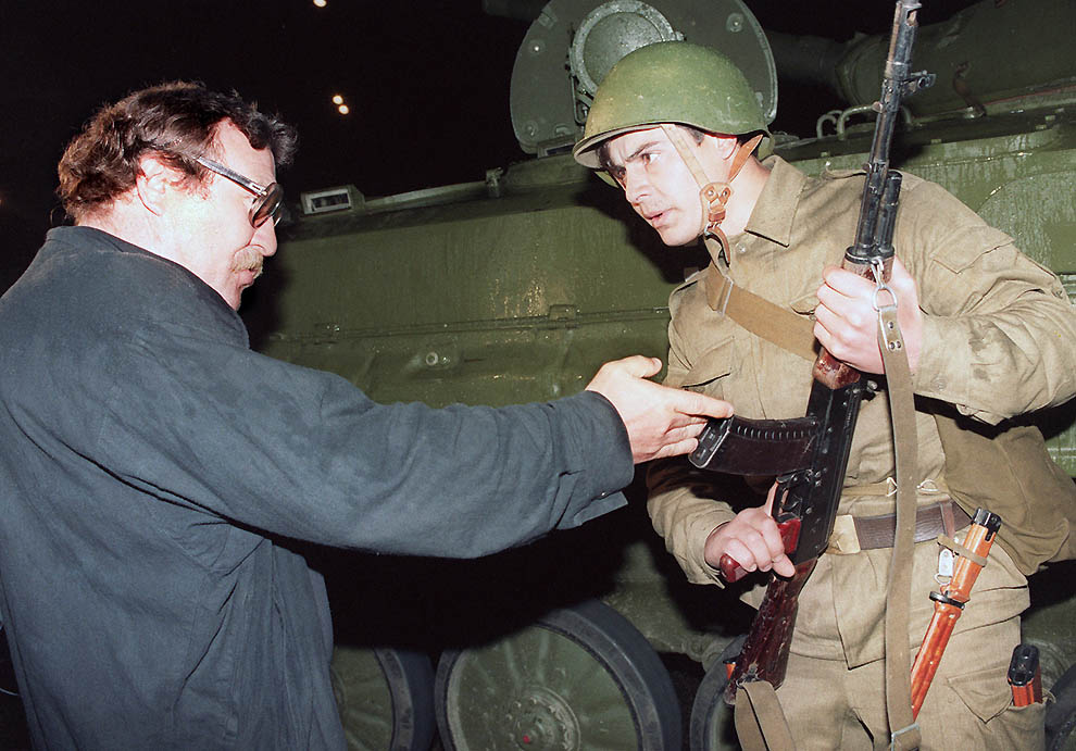 13. Демонстранты играют на гитарах и общаются с солдатами перед Белым Домом 20 августа 1991 г. (Alexander Nemenov/AFP/Getty Images)