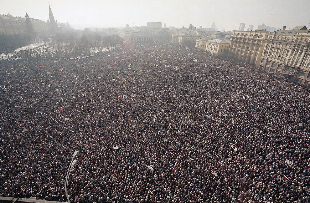 3. Сотни тысяч человек собрались на Манежной Площади в Москве 10 марта 1991 года с требованиями отречения от власти Михаила Горбачева и его коммунистических соратников. Толпа насчитывала 500 тысяч человек, и это была самая многочисленная антиправительственная демонстрация со времён прихода коммунистов к власти. (AP Photo/Dominique Mollard)