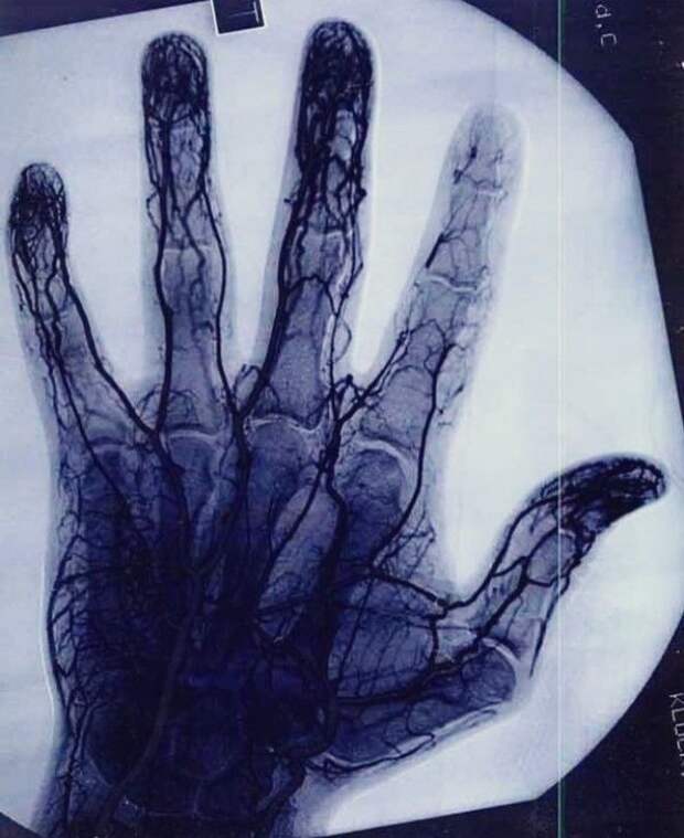 Ангиограмма показывает поврежденные сосуды указательного пальца мастера по йо-йо.