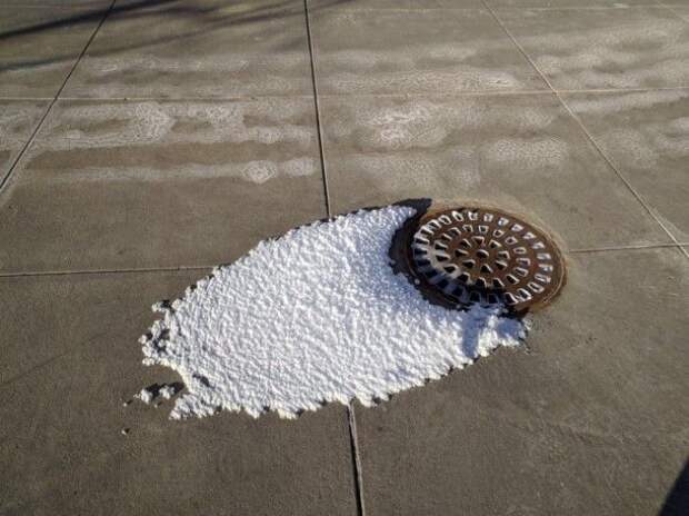 Пар из канализационной решетки превратился в снег из-за мороза.
