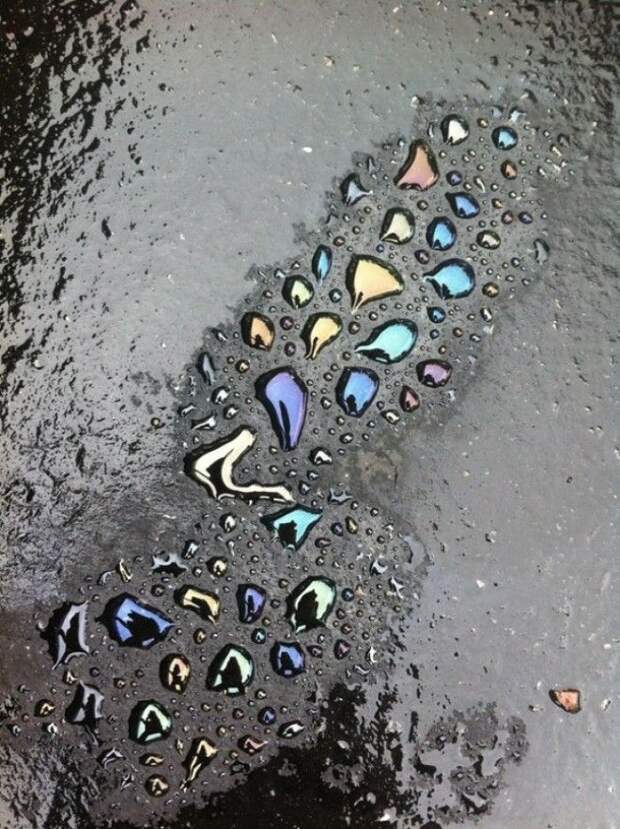 Брызги воды на масляном пятне.