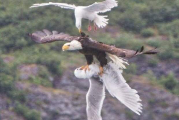 Чайка пытается спасти друга из когтей орла.